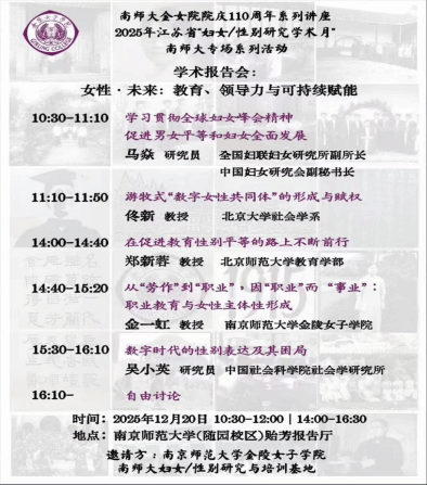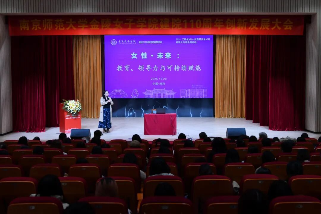 2025年12月20日,南京 —— 为纪念金陵女子学院建院110周年,由南京师范大学金陵女子学院主办的学术报告会“女性未来:教育、领导力与可持续赋能”于今日在随园校区贻芳报告厅成功举行,此次学术报告会也是2025 江苏省妇女/性别研究学术月南师大专场系列活动之一。此次报告会汇聚了来自全国妇联妇女研究所、北京大学、北京师范大学、中国社会科学院及南京师范大学的知名学者与专家,围绕女性教育、数字时代性别表达、职业教育与主体形塑、全球妇女发展等议题展开深入探讨。