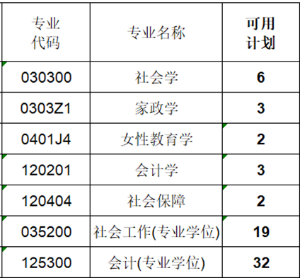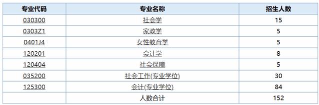 学院现设有社会学一级学科硕士学位授权点、 “会计学”、“社会保障”、“女性教育学”、“家政学”等二级学科硕士学位授权点以及会计专业硕士学位(MPAcc)授权点、社会工作专业硕士学位授权点。学院现有“财政学”二级学科博士点(和商学院合作)和“社会工作”二级学科博士点(和心理学院合作)。