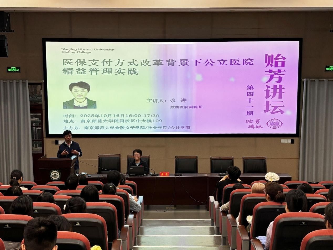 为拓宽学生们的专业视野、提升对公共部门财务问题的研究广度,并深度融合我院在公共产品、公共卫生领域的教研特色,10月16日下午4时,南京师范大学金陵女子学院/社会学院/会计学院在随园校区中大楼109报告厅举办第41期“贻芳讲坛”。本次讲座围绕“医保支付方式改革背景下公立医院精益管理实践”这一主题展开,特邀南京鼓楼医院副院长余进担任主讲人。讲座由院长封思贤教授主持,2025级会计学、会计专硕与社会保障专业全体研究生参与。