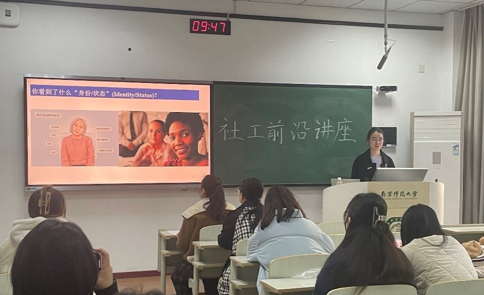 讲座伊始,陈晨老师从展示两张图片的身份状态切入,引出少数身份群体的含义,介绍了少数身份群体的类型及其所面对的相关压力。接着,陈晨老师以“68岁农村慢病女性A阿姨”的虚构案例,从单一身份与交叉性身份两个维度,分析了服务对象面临的压力,并对大家提出疑问“多重少数群体身份压力所带来的影响是1+1=2的吗?”,引发了在场的同学进行思考与互动。