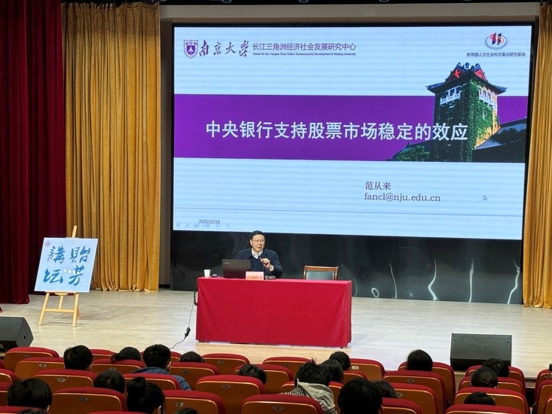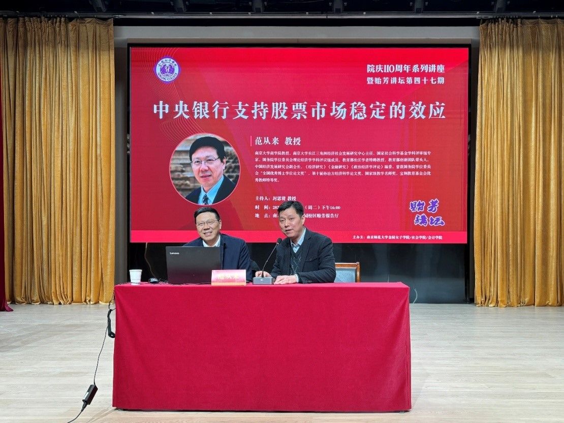 为庆祝南京师范大学金陵女子学院成立110周年,2025年12月16日下午,金陵女子学院在随园校区贻芳报告厅举行第四十七期贻芳讲坛学术活动。本期贻芳讲坛特邀国务院学位委员会理论经济学学科评议组专家、教育部重大人才工程项目特聘教授、南京大学商学院范从来教授,讲座主题为“中央银行支持股票市场稳定的效应”。本次讲座由封思贤教授主持,我院会计、会计学专业全体同学及部分老师参加了本次讲座。